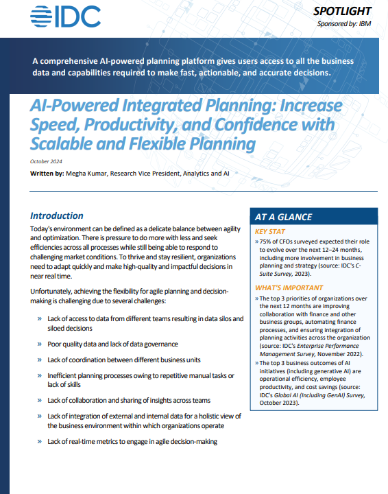 Get IDC’s latest insights in AI-Powered Integrated Planning: Increase Speed, Productivity, and Confidence with Scalable and Flexible Planning. This report examines how AI-driven solutions are reshaping the role of today’s CFO and enhancing financial planning.